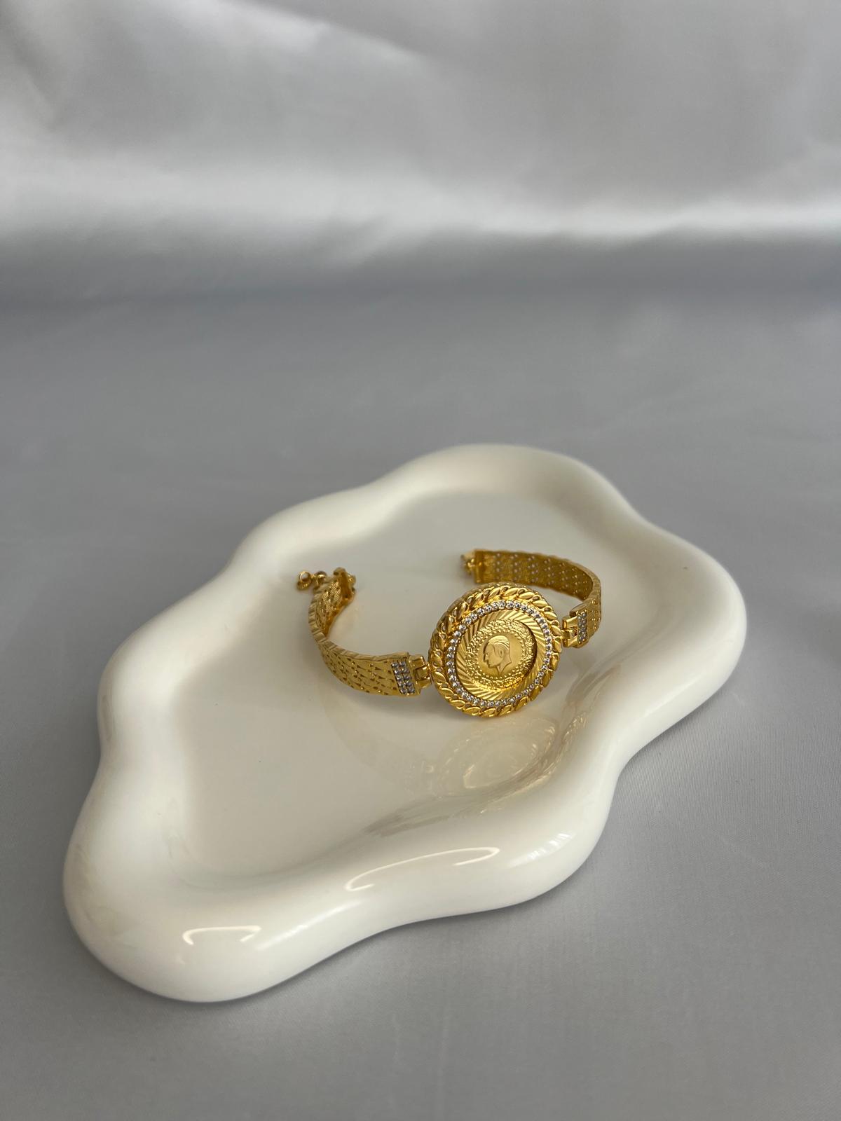 Dieser exquisite Armreif ist ein zeitloses Schmuckstück, das Eleganz und Raffinesse verkörpert. Hergestellt aus hochwertigem Material und sorgfältig vergoldet mit 22 Karat Gold, strahlt dieser Armreif Luxus und Klasse aus.